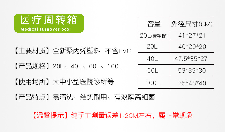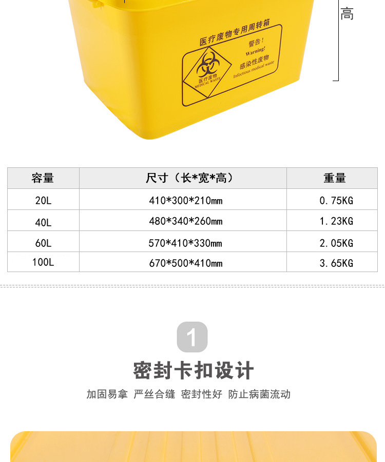 医疗废物周转箱(桶)是盛装经密封包装的医疗废物专用硬质容器,该容器用于医疗废物运送车,运送医疗废物和供医疗机构内部收集医疗废物时的暂时贮存。箱盖设有密封槽,整体装配密闭,能防止液体渗漏箱体,污染车厢和外环境的作用。可一次性或多次重复使用,使用后应及时进行清洁消毒。